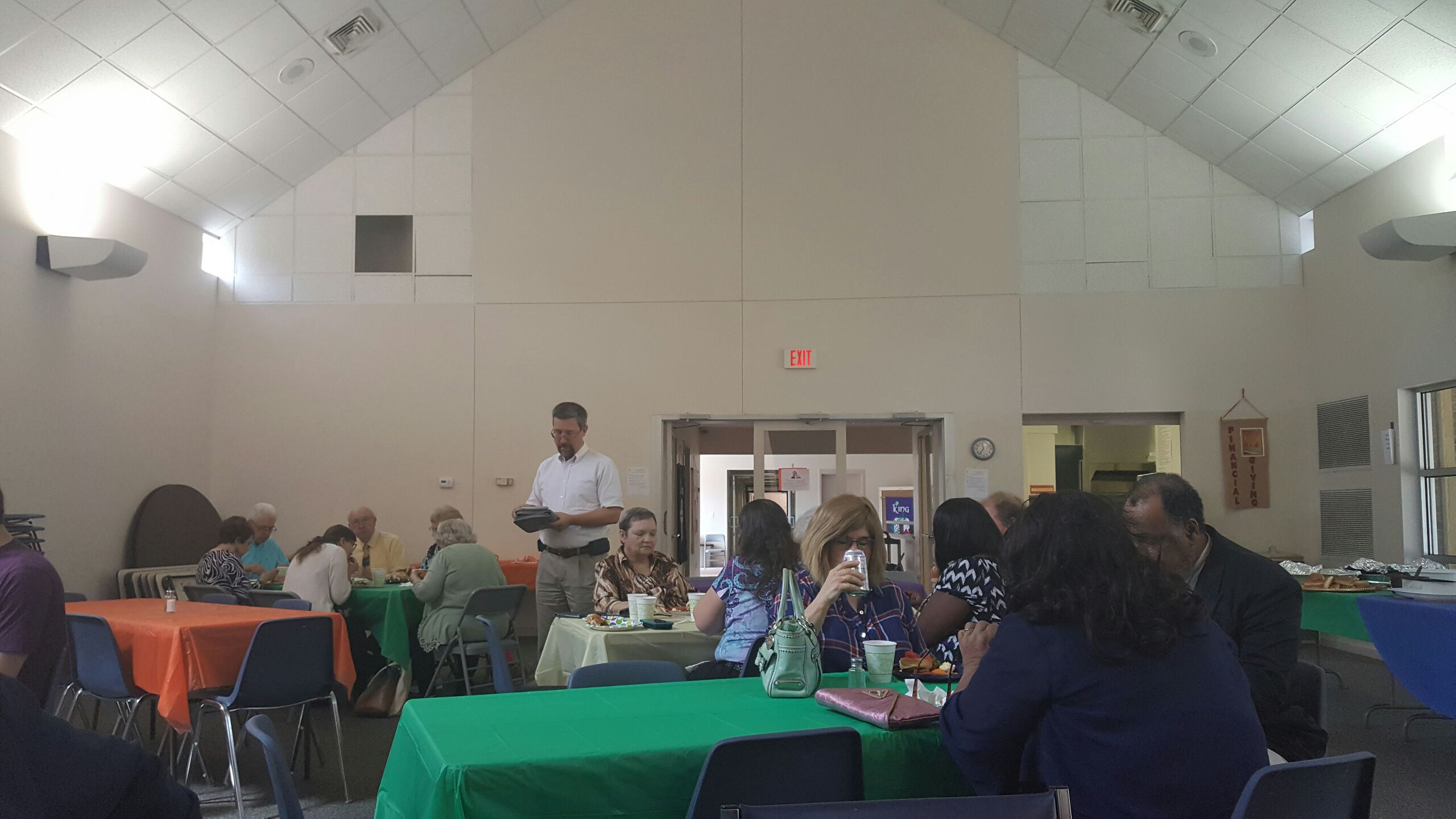 AMITY members enjoy culinary delights as they listen to a powerful Sunday School message led by Ed.